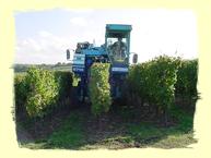 Der Vollernter, die Maschine mit der die Trauben geerntet werden, nimmt immer eine Reihe des Weinbergs in die Mitte. In seinem Inneren befinden sich Schläger, die die Stöcke so kräftig schütteln, daß die Beeren locker werden und auf ein Förderband fallen.